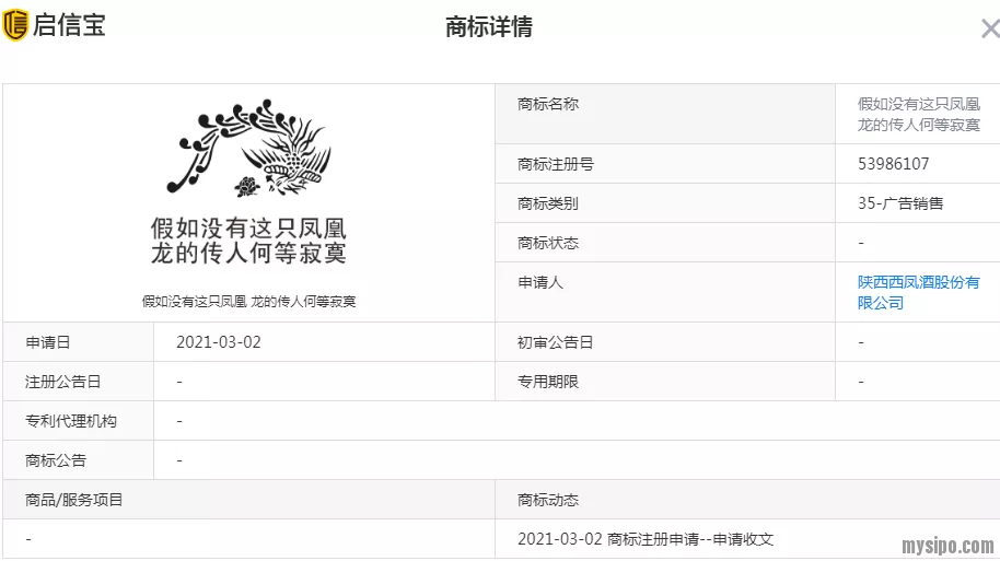 据新京报讯,陕西西凤酒股份有限公司(以下简称:西凤酒)于3月2日申请了“假如没有这只凤凰 龙的传人何等寂寞”商标。蜗牛纳根据启信宝查询看到,该商标国际分类为35-广告销售,商标状态为“商标申请中”。