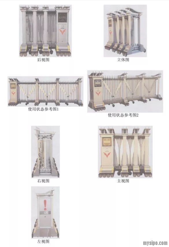 其次,被诉侵权产品“领航1号(LH-001)”电动伸缩门外观设计与涉案专利均包括驱动部、门排系统和门排主立柱,立柱表面都有罗马柱的垂直条纹设计,都有门头、踢脚、滚轮,整体形状基本相同。两者都是属于罗马风格的电动伸缩门。即使仅从使用状态参考图的角度与被诉侵权产品进行比较,亦存在以下区别:1.涉案专利的门排上具有“V”字形门排加强系统,被诉侵权产品无此设计;2.两者门排系统连接方式不同,涉案专利每个单元都由上下部和中部的伸缩网连接,而被诉侵权产品没有上下伸缩网的设计。由于上述区别点均位于伸缩门使用时的可见位置,且“V”字形门排加强系统处于瞩目位置,使得两者具有不同的整体视觉效果,故仅从使用状态参考图的角度比对,“领航1号(LH-001)”被诉侵权产品的外观设计与涉案专利既不相同也不相近似。