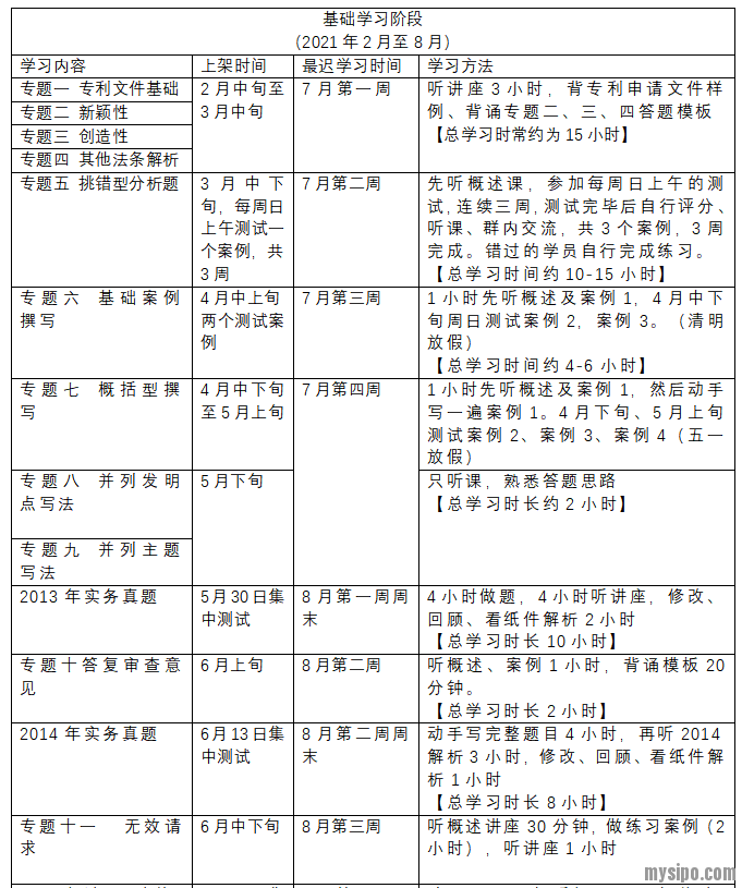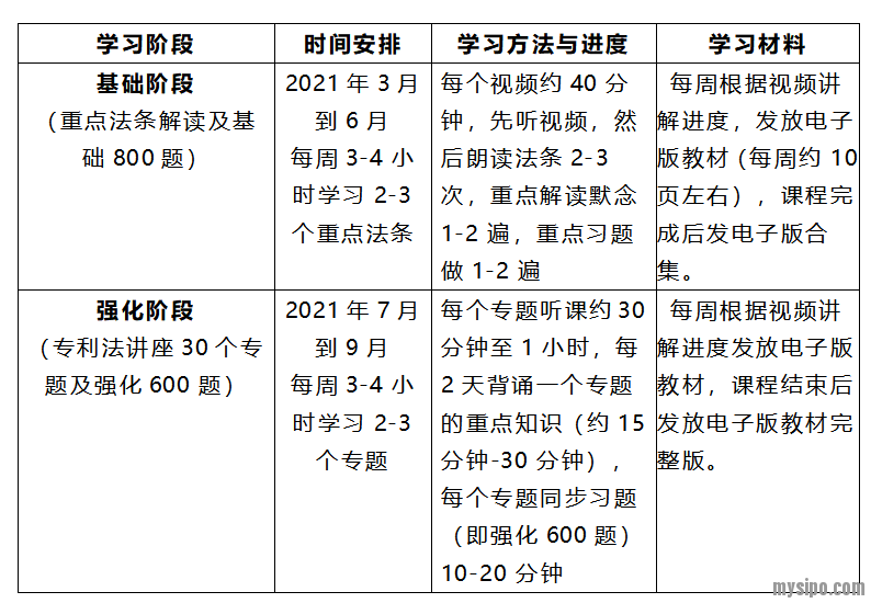 (专利法强化班包括基础、强化两阶段,全程班包括基础、强化、冲刺三阶段)。