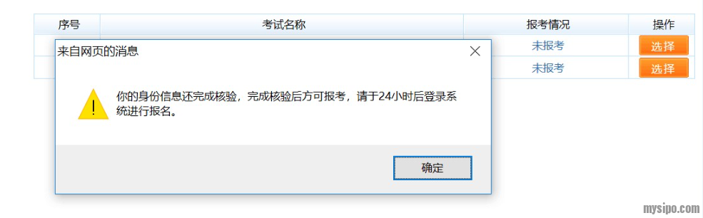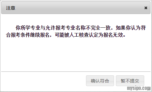 报名信息确认时,系统对考生所填写的学历专业与选择的可报考专业进行校验,若所填专业与报考条件所列专业不符,则弹出以下提示页面: