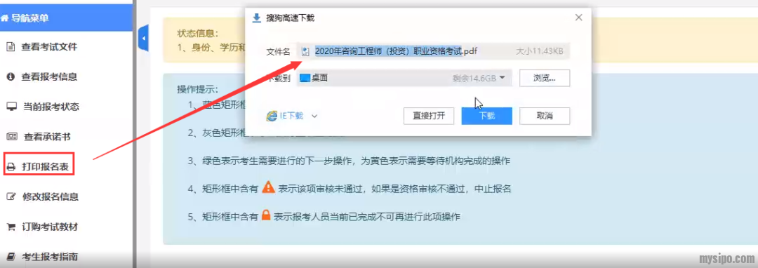 报名信息确认后需要进行打印报名表的操作,点击系统左侧菜单栏的打印报名表按钮,进入报名表下载界面(见下图),点击【下载】。