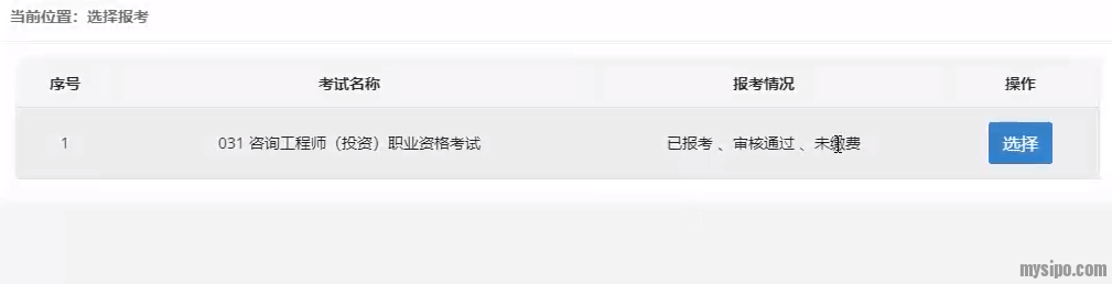 点击【选择】按钮,进入报考状态。如状态显示审核通过,报考人员即可按规定时间支付考试费用(见下图)。