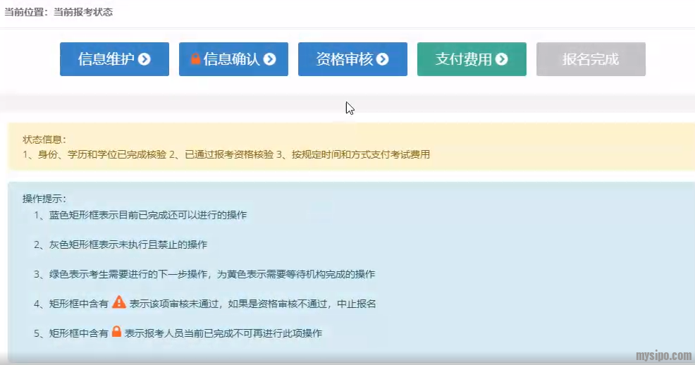 报考人员打印报名表后,需要按照各地考试机构的规定到指定审核点进行资格审查。资格审核通过后,符合报考条件的报考人员再次登录网站,并查看报考情况。如图: