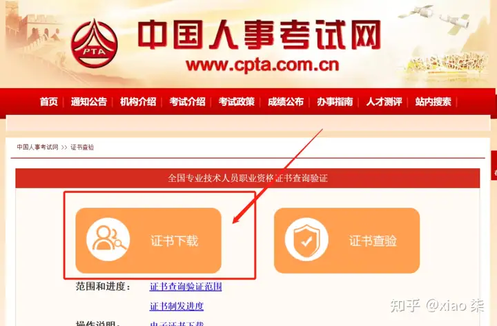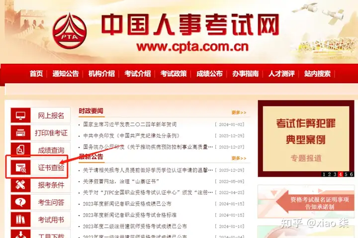 访问中国人事考试网(http://www.cpta.com.cn)首页,点击左侧菜单中的[证书查验]。