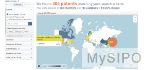 选择“以地图形式查看”选项,则出现一张交互式的世界地图,地图上会标出发明人或专利权人的准确定位信息。鼠标停留在所属地上会出现所属地的名称以及所属地发明人或专利权人的专利数量。