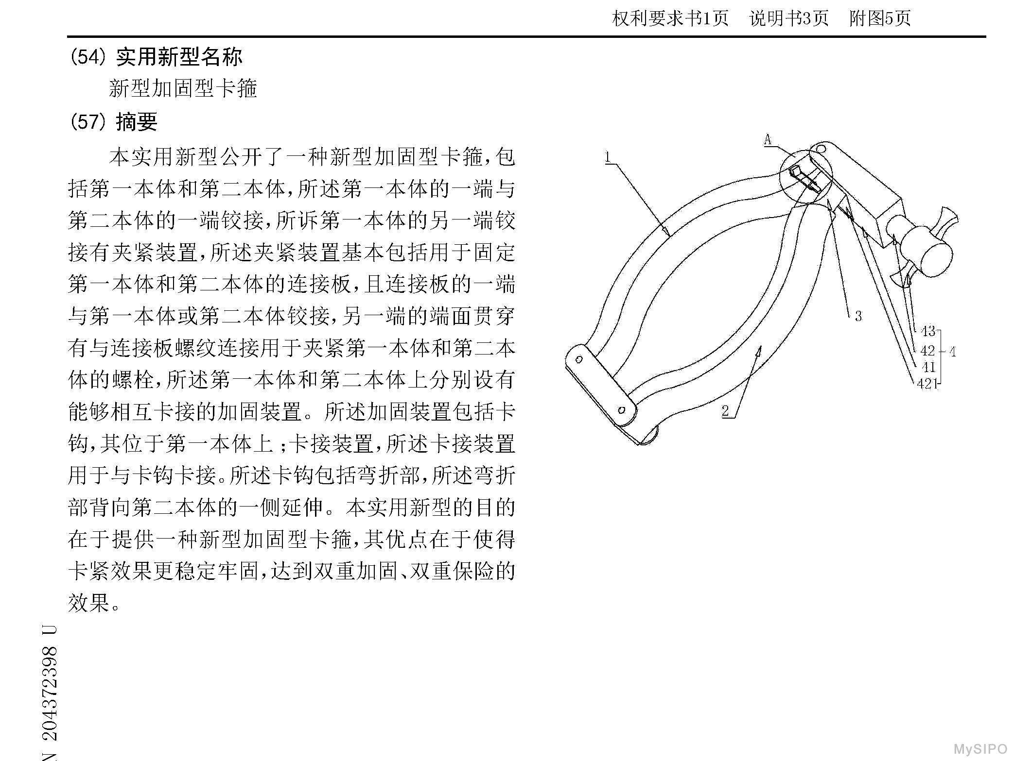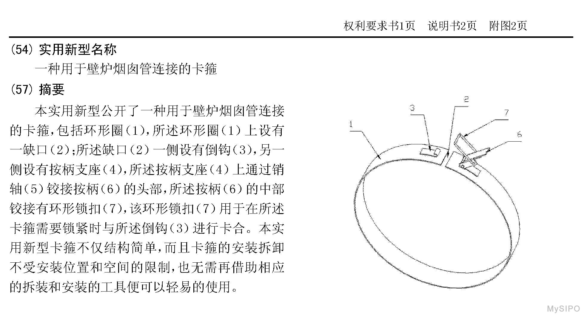冒着被领导训斥的危险,我检索了一下有关卡箍的专利,发现该下图的专利与涉案专利很类似,申请号就在图中,大家可以自己下载看,简单解释一下,该卡箍为了防止元件散落,采用一体式结构,两个卡环,一端为铰接,另一端通过螺母11结构连接,有一连接杆3和5。