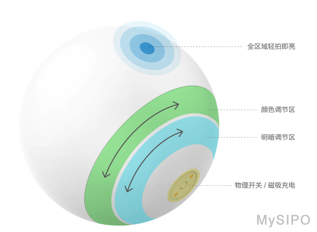 慧星灯的灯球上有颜色调节区、明暗调节区和轻拍即亮区。那难以想象的22950颜色,由亮到暗的过程,开或关的调节全在灯球上实现。除了可以用不同颜色照明,慧星灯还可以停留在变色过程中,这时候最适合拿来调节气氛。