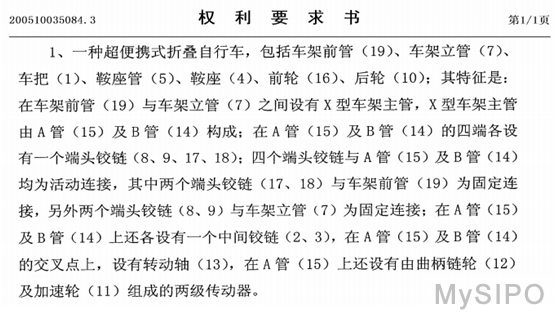 好歹能把自己的技术方案讲得清清楚楚,至于保护范围就不管了,反正能授权就行。预计1980元发明专利代理费,能达到这个程度。看下面这篇200510035084.3,一条权利要求,一段长长的文字。保护范围不管怎样,至少能拿到一个专利证书。这个技术着实是不错呢,许可给了一家自行车公司,我还买过这个自行车呢,600元,折叠方式确实很新颖,后来被偷了。
