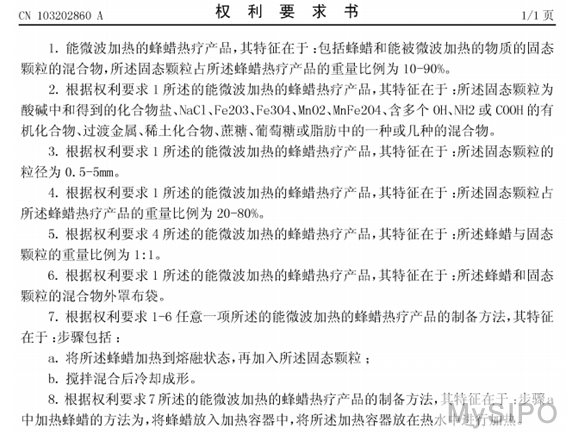 不仅仅能把客户自身的技术方案写清楚,而且要在原来的基础上加以扩展,尽可能扩大保护范围。比如CN103202860A,发明人原先的技术方案是在蜂蜡中掺杂一些大粒盐,大粒盐被微波炉加热后就能将热量传到给蜂蜡。但撰写专利的时候,将大粒盐扩展为所有能够为微波加热的固态颗粒,而且还增加了一项制备方法。上述措施,不仅专利更容易授权,增加了权利稳定性,而且保护范围也有所扩展。最终,因为审查员检索到了比较接近的专利技术,因此将产品权利要求全都删除,将保护范围缩小到了制备方法而获得授权。