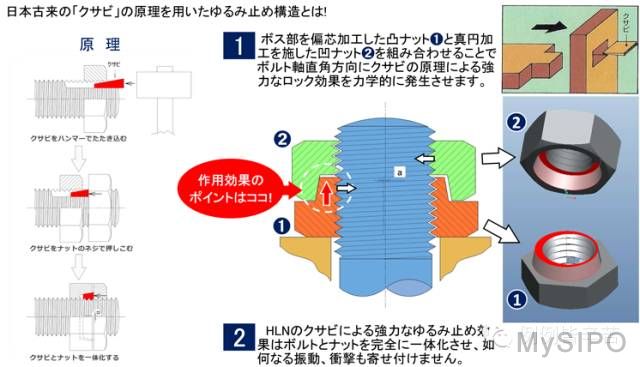 发明人若林克彦想到的法,是在一个螺丝钉上使用呈“凹”“凸”形状的两种螺母。下方呈凸状的螺母,在加工时中心稍许错动(偏心加工),起到楔子的作用。上方呈凹状的螺母,则不作偏离中心的加工(圆形加工),于是形成了锤子揳打楔子的功能。这样的两个螺母合二为一,松动问题就迎刃而解了。