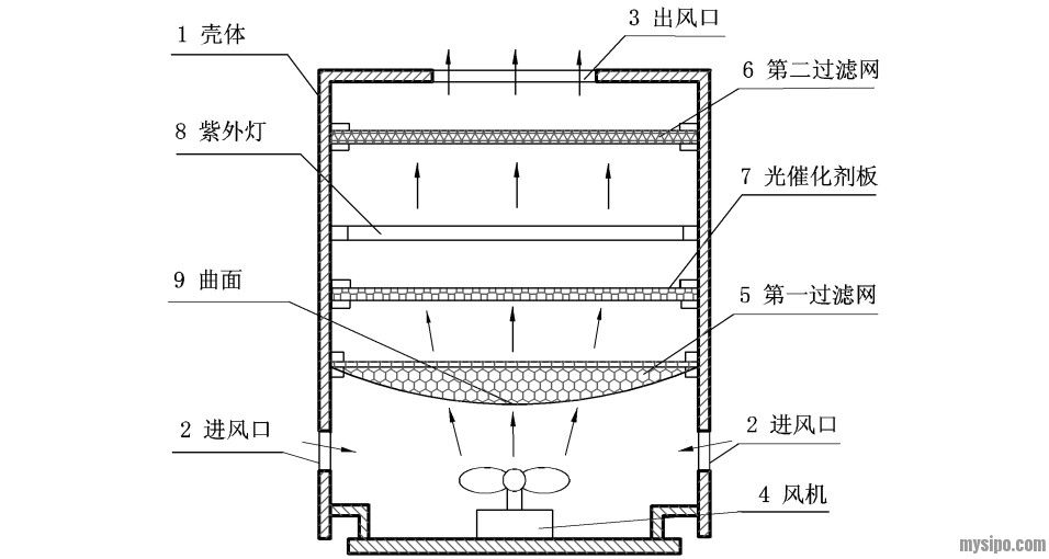 如图1所示,该空气净化器包括壳体1、位于壳体下部两侧的进风口2、位于壳体顶部的出风口3以及设置在壳体底部的风机4,所述壳体1内从下往上依次设置有第一过滤网5、光催化剂板7、紫外灯8和第二过滤网6。所述第一过滤网5是活性炭过滤网,其具有向下凸起的曲面9。所述第二过滤网6是PM2.5颗粒(直径小于等于2.5微米的颗粒物)过滤网。我公司发明的光催化剂板7由两层表面负载有纳米二氧化钛涂层的金属丝网和填充在两层金属丝网之间的负载有纳米二氧化钛的多孔颗粒组成。
