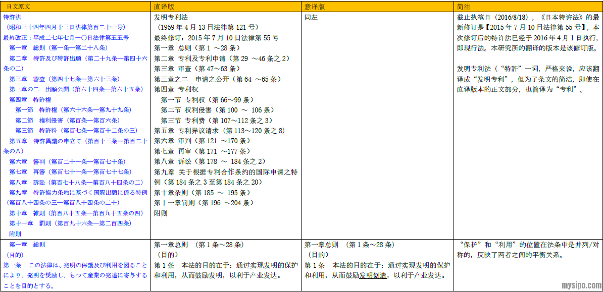 下文是日本特许法现行法(执笔日2016 年8 月18 日)的部分中译文(第1-20 条)。由于中日专利法在专利制度、条文设置、条文的撰写方式、专业用语等方面存在较大差异,即使译为中文,也多有不易理解或容易误解之处。因此,本次翻译除了直译版,还有对照的意译版(对于某些法条和用语,意译更容易理解),并在必要之处(主要是对中日专利法中的差异点)加以简注,期望这个版本能为理解日本专利法提供一些便利。