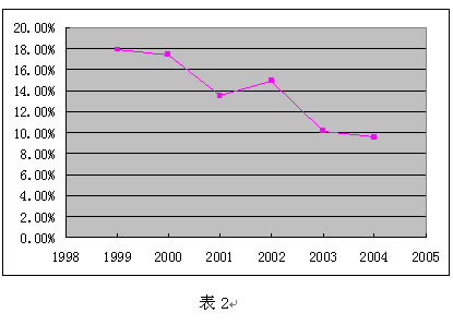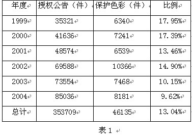 国内申请人提交的外观设计专利申请,从1999年至2004年,已经授权的353709件申请中,在简要说明中声明请求保护色彩的有46135件,占所有授权专利的13.04%。表1是1999年至2004年每年的外观设计专利申请授权量和其中声明请求保护色彩的专利数量及其所占比例。从表1中我们可以看出,在所有已授权的外观设计专利中,在简要说明中声明请求保护色彩的专利所占的比例(除了2002年)呈连年下降趋势。2002年的授权量增长迅速,因此请求保护色彩的数量受此影响也大幅增长,其所占比例略有回升(具体下降走势图见表2)。