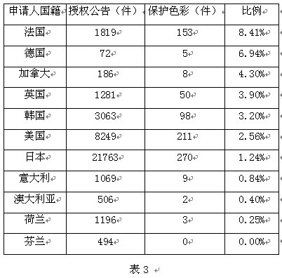国外申请人在中国提交的外观设计专利申请中请求保护色彩且同时要求了优先权的案例,多为来自法国、英国、日本、韩国、瑞士的申请,这些情况从一个侧面反映了国外申请人对单独提出请求保护色彩的重视程度。表3为1999~2004年部分国外申请人在中国提交的外观设计专利申请授权数量和其中请求保护色彩的数量及其所占比例。