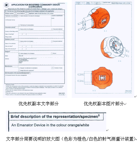 欧盟的大部分申请没有简要说明之类的文字描述,只是在视图中相应地用色彩表示产品。但也有一些申请,在简要说明中直接指明了外观设计的色彩,在下面的例子中,优先权副本文字部分简要说明中的英文翻译为:色彩为橙色/白色的射气测量计装置。