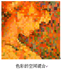 色彩并置混合:当把红、蓝色点或色块并置的画面经过一定的距离,就会发现红色与蓝色变成了一个紫色,只是由于空间距离和视觉生理的限制,眼睛辨别不出过小或过远物象的细节,因此把个不相同色块感受成一个新的色彩,这种现象便称为色彩的并置混合或空间混合。