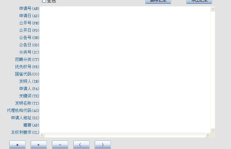 用户点击‘申请号(AN)’检索字段,输入申请号检索式,语法:AN XXXXXXXXXXXX。其中XXXXXXXXXXXX代表申请号,最大12位,最少2位。