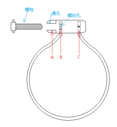 由图可见,当螺栓刚插入通孔拧入B处螺纹孔时,由于螺栓和通孔之间是活动的,因此并不能借助和通孔之间的连接对B施加向C处的压力。