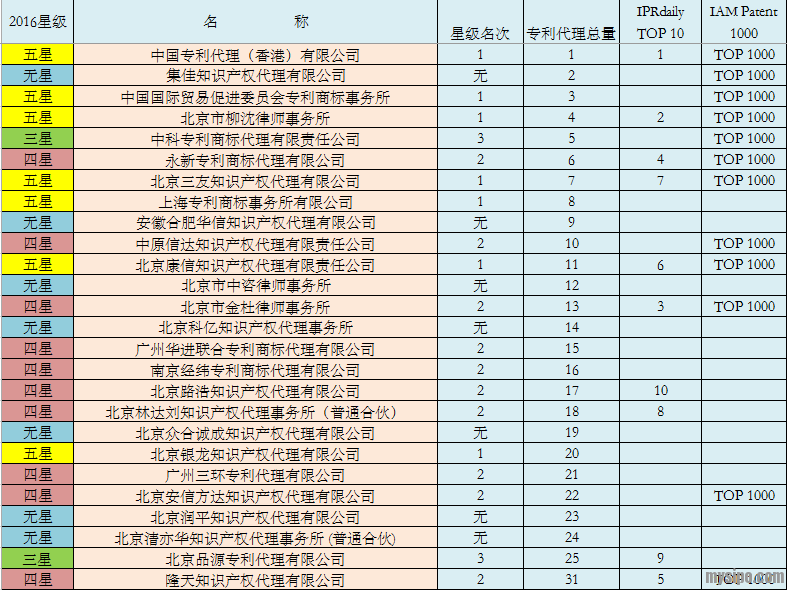 2016年10月27日,IPRdaily联合知识产权出版社知了网和DI inspiro知识产权大数据系统发布本年度发明授权专利代理总量前10名、涉外专利案源代理量前10名、PCT代理量案源数量分布情况、中国专利案源代理量前十名和发明授权专利中代理量 Top 100名单(数据提取时间为2016年1月1日至2016年9月30日)等榜单信息。接着于2016年11月26日,由IPRdaily主办的2016全球知识产权生态大会(GIPC 2016)在京落幕。经专家评委会评定,港专、柳沈、金杜、永新、隆天、康信、三友、林达刘、品源、路浩等机构赫然入选“2016年度中国专利代理十强”。