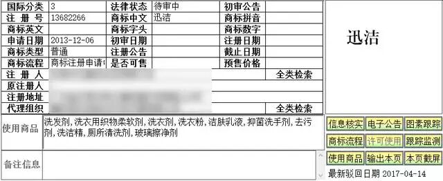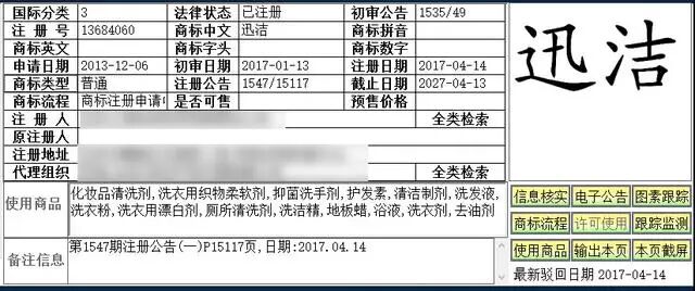 以上图片显示的商标同是3类,商标名同为“迅洁”,申请日期同为2013年12月6日。为什么一个已注册,一个待审这么多年。