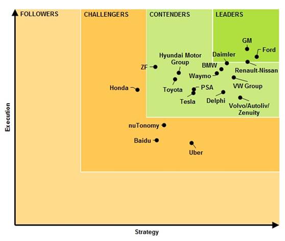 上图为Navigant Research的自动驾驶研究报告对主要车企在无人驾驶领域表现的比较,从策略(Strategy)和执行(Execution)两个维度上,将这些车企分为领导者(Leader)、竞争者(Contender)、挑战者(Challenger)和跟随者(Follower)。可以看出特斯拉目前并不领先,但基于特斯拉以往在高科技领域的优异表现,相信其在无人驾驶领域也会表现不俗。