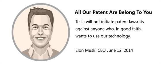 2014年6月12日,特斯拉的CEO埃隆·马斯克宣布,将开放特斯拉的全部专利,鼓励所有汽车制造商都来关注、使用特斯拉的专利。随后丰田也开放了其电动汽车相关专利,越来越多的汽车企业开始进入电动汽车行业。