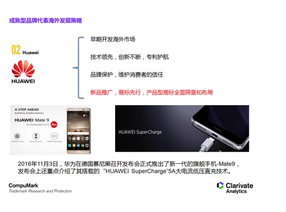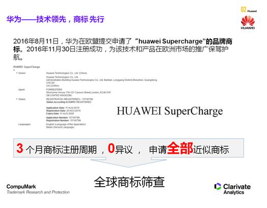 华为深知商标在塑造品牌形象上所发挥的重要作用,在专注产品不断创新的同时也积极进行品牌保护,在新产品推出和投入到国际市场前会针对每一个系列产品对应的类型,甚至产品技术亮点及宣传口号等,进行国际化的商标查询和商标注册申请。华为在欧盟商标的高效注册,离不开他们在申请商标前通过全球商标筛查了解到整个欧洲市场上的相关商标布局与现状,挑选了注册几率高的商标方案,并进行全面申请,降低了成本的同时也大大降低了被异议或被风险,提高了注册效率。