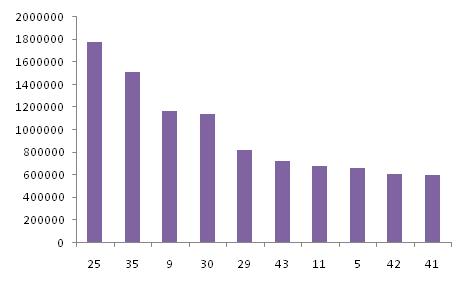 就具体类别来说,如图7所示,国内商标注册最多的第25类(服装、鞋、帽);35类(广告,商业经营;商业管理;办公事务),第9类(计算机等产品)。然而,从图8中可以看出,中国在其余金砖四国的注册商标更多集中于第9类(计算机等产品);第7类(机器、机床、马达和引擎)和第25类(服装、鞋、帽)等类别。因此,我们不难看出,中国产业升级和工业4.0计划的实施,电脑和车辆等高科技产品已经开始成为或即将成为出口的主要产品。