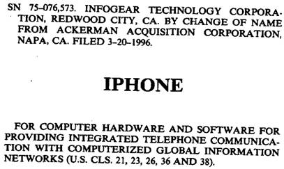 标1的注册人其实是一家叫 “ACKERMAN ACQUISITION CORPORATION (后更名为INFOGEAR TECHNOLOGY CORPORATION)”的公司。该公司于1996年就申请了商品类别9的此商标。随着INFOGEAR在2000 年被思科收购,该标转移到了思科名下,并由思科的另一个子公司Linksys生产的相关产品使用。因此,2007年初苹果发布第一代iPhone前,不得不与思科联系,以试图获得授权。