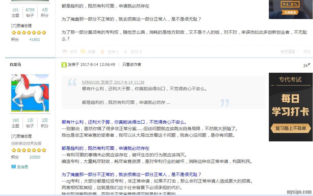 见到没有,从8月14号开始,因为反对其观点,白龙马就开始各种抨击(可能重点还是嫉妒本人某些案子可能成为经典,毕竟我们这边专利补助低得很,之前一直基本上只够官费;2016年后专利补助虽然上涨了,后来的案子缺少成为经典的可能,所以一般就没分案,也没多申请)。
