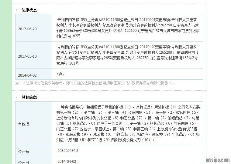 原来发明人叫“孙绍科”,2014年《我爱发明》放过他的发明项目。我又根据这个名字查了一下专利,发现他与面条机相关的专利只有一件实用新型,申请号是201320658523.6,这件专利有过权利转移记录,正是在前几个月转移给了纪鑫鑫。