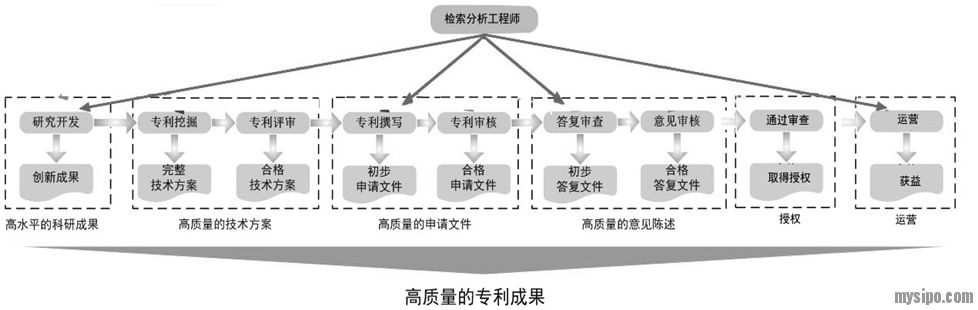 同时,专利检索分析人员,也在提升专利的质量过程中起到不可或缺的作用。参见下图,可以说专利检索分析人员的检索工作贯穿专利全生命周期过程的始终。在内部的团队工作量饱和或者能力欠缺的情况下,企业可以将部分或全部的专利检索分析即预警工作外包给可信赖的并且能够完成相关工作的外部顾问专家来完成。在委托时还需要通过保密协议来确保安全。外部顾问可以是专利代理人、专利律师、或从事过专利审查的顾问等。