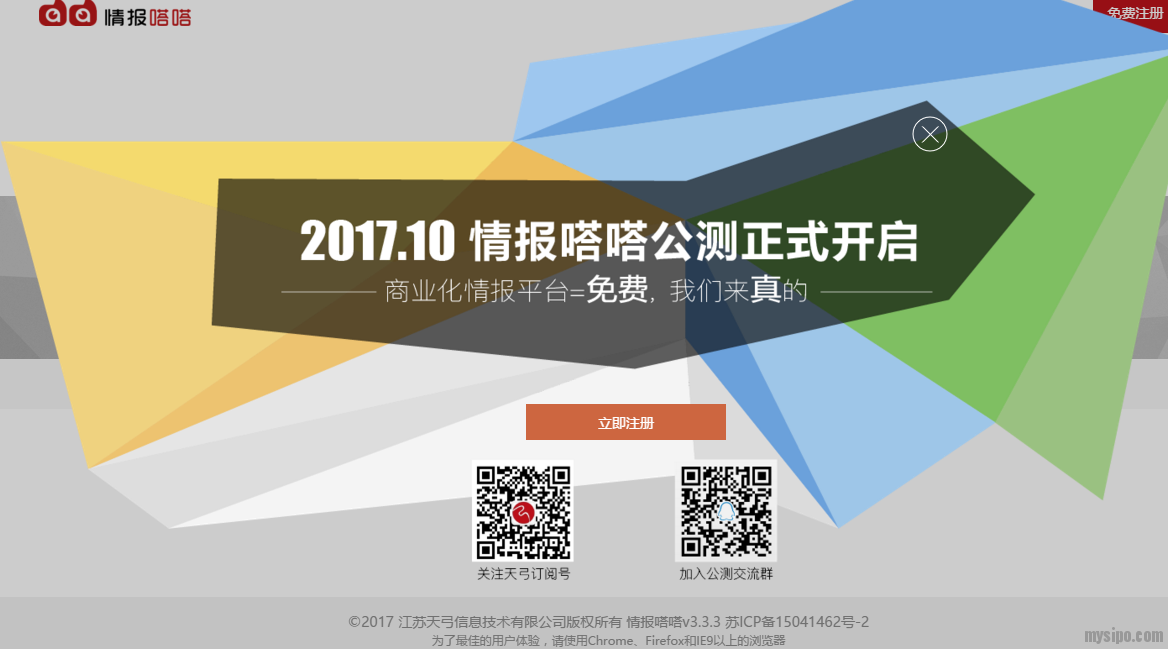 www.tiikong.com现在免费开放公测,随时随地可以免费注册使用,企业研发热点及方向、竞合关系企业推荐、监控、分析报告现阶段全部免费,欢迎注册使用、