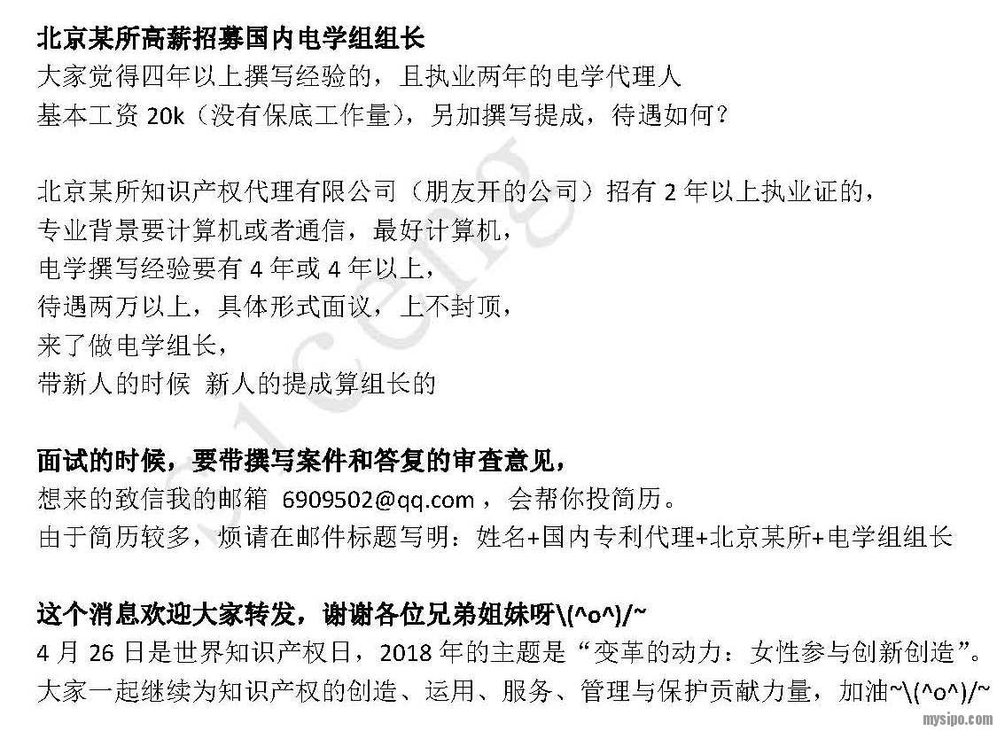 北京某所知识产权代理有限公司招有2年以上执业证的,专业背景计算机或者通信,最好计算机,电学撰写经验有4年或4年以上,待遇两万以上,具体形式面议,上不封顶,