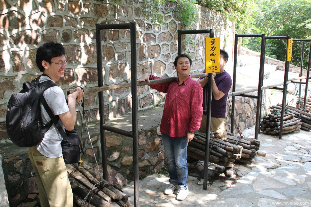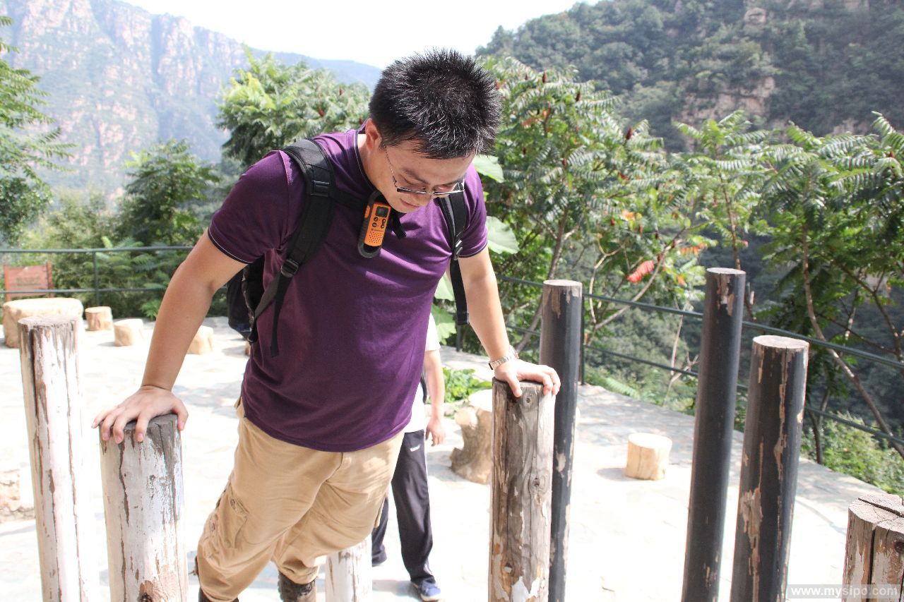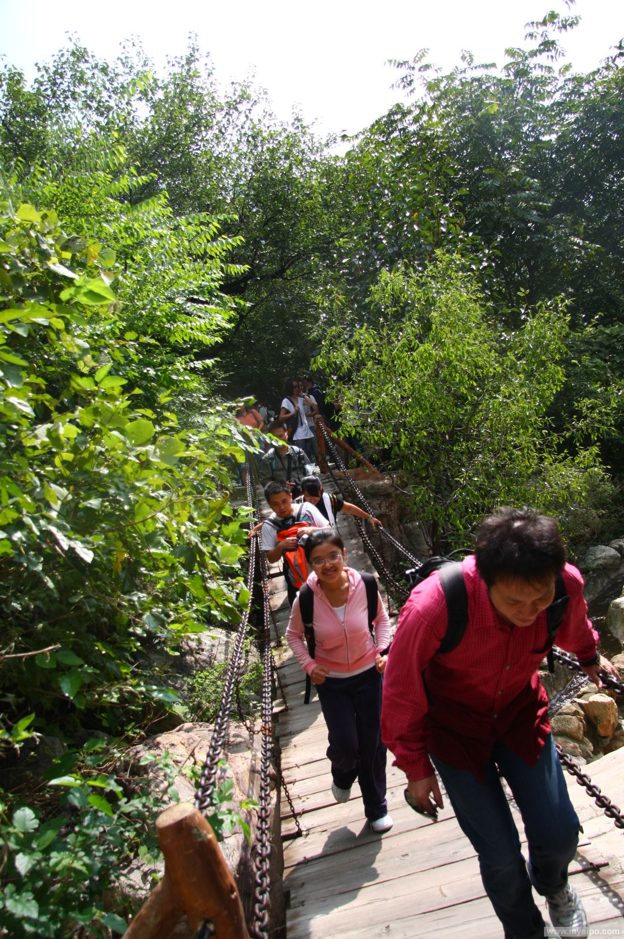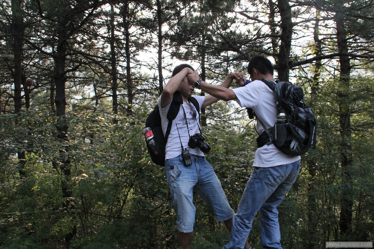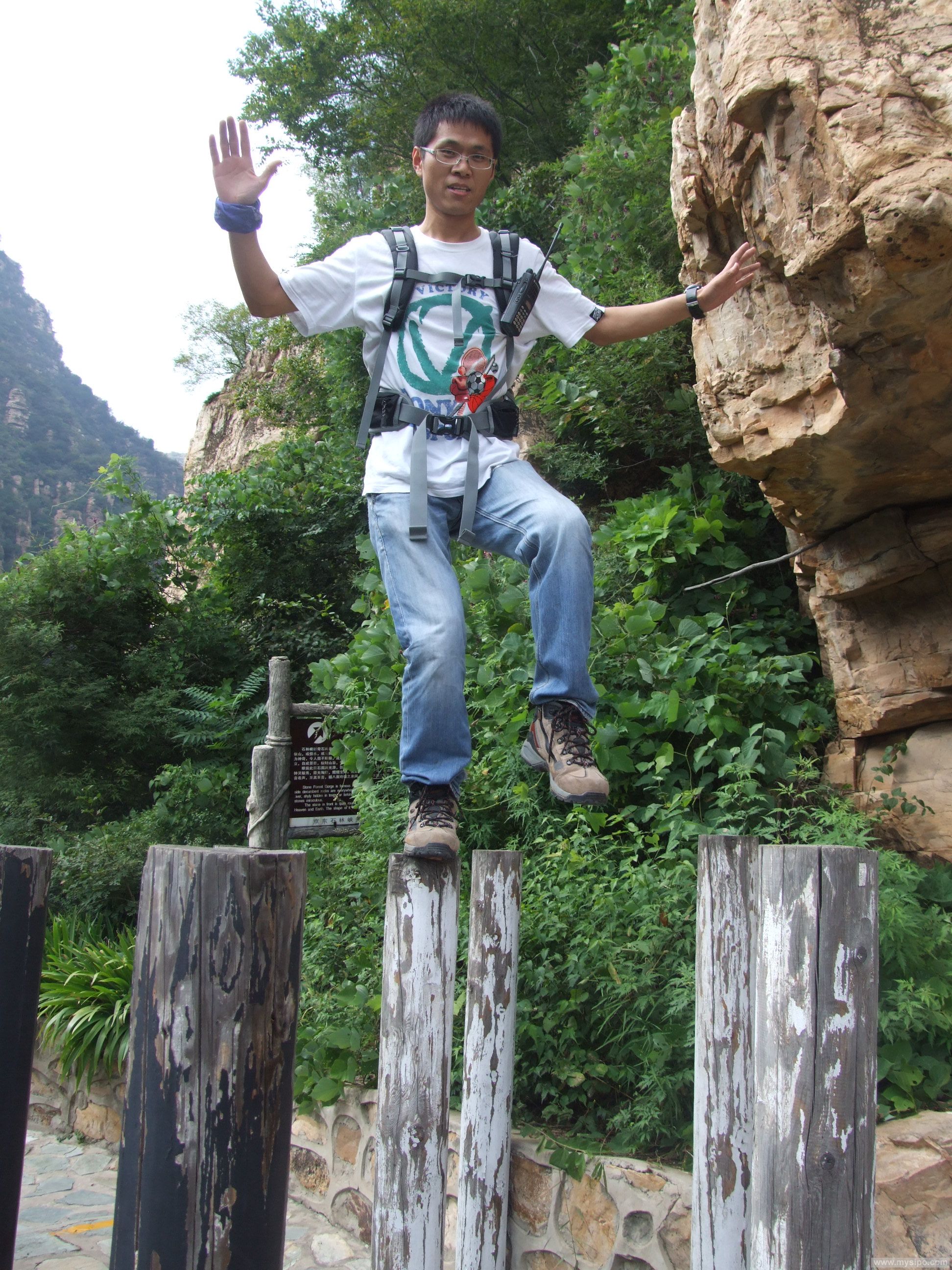 山脚下有几处简单的拓展训练设施,这是我在和程宣合作过独木桥——两人分别从只有一拃宽的桥两头向中间走,相遇后手拉手,靠良好的配合掌握平衡,错身而过,再从另一头下来。(话外音:媒婆,怎么没把桥拍上呢!)