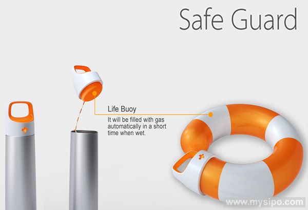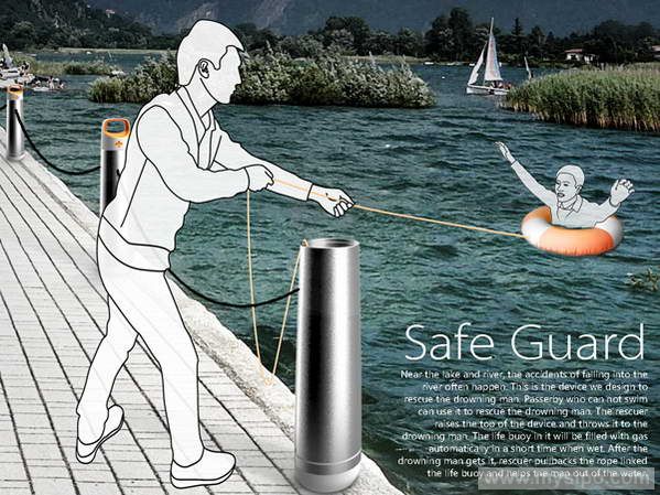当有人落水时,路人可迅速开启救援装置扔向落水者,内置的充气救生圈遇水便会迅速充气。