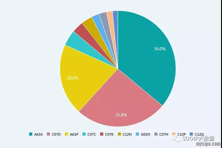 如图2所示,可知辉瑞公司失效专利主要涉及的领域是医用、牙科用或梳妆用的配制品(A61K),杂环化合物(C07D),化合物或药物制剂的特定治疗活性(A61P),分别占比为36.0%、25.8%、20.0%。说明辉瑞公司在以上领域中的技术研发成熟度较高,仿制药企业可根据自身需求及上述失效主要涉及领域,选择适合自身企业的失效专利技术进行模仿。