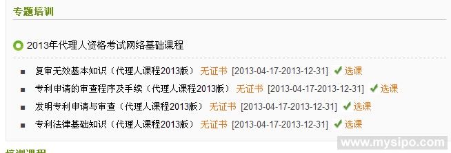 培训中心总站新开设“2013年代理人资格考试网络基础课程”培训专题。内容包括《复审无效基本知识》、《专利申请的审查程序及手续》、发明专利申请与审查》、《专利法律基础知识》共四门代理人资格考试基础课程。欢迎大家踊跃报名学习。