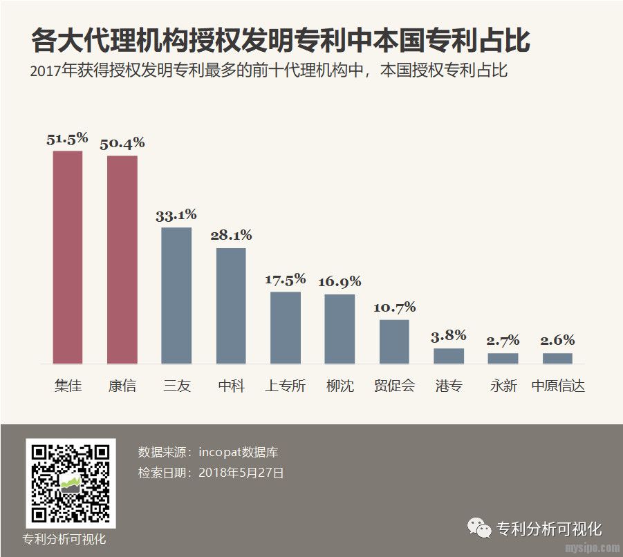 我们选取了2017年获得授权发明专利量最多的前十大代理机构的申请来源国做了分析,比较了它们代理的国内申请的比例。