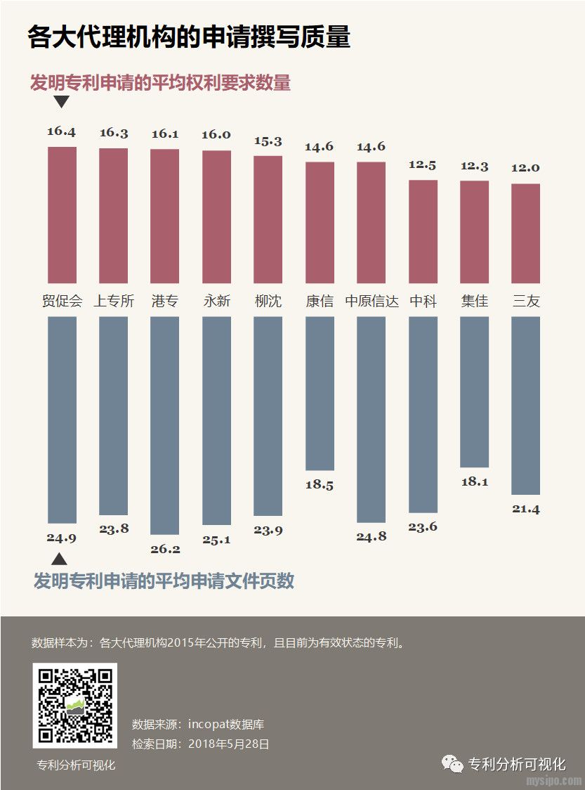 这些代理机构的发明专利申请平均权利要求数为12-16项,文献页数为21-25页。这两项数据也是高于平均水平的。