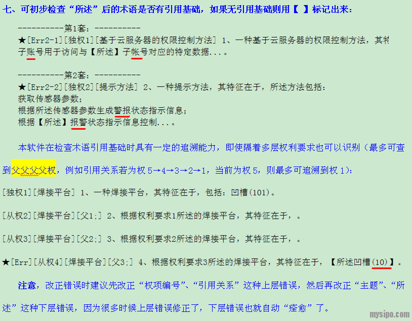 (8)对于权项中的“所述+术语”,可初步检查该术语是否已在“本权项、父权项、父父权、父父父权、父父父父权”中出现过,如果均未出现过则会对“所述”或“所述+术语”进行【】标记,代表无引用基础。对于术语识别的局限性,请参见功能举例说明文档
