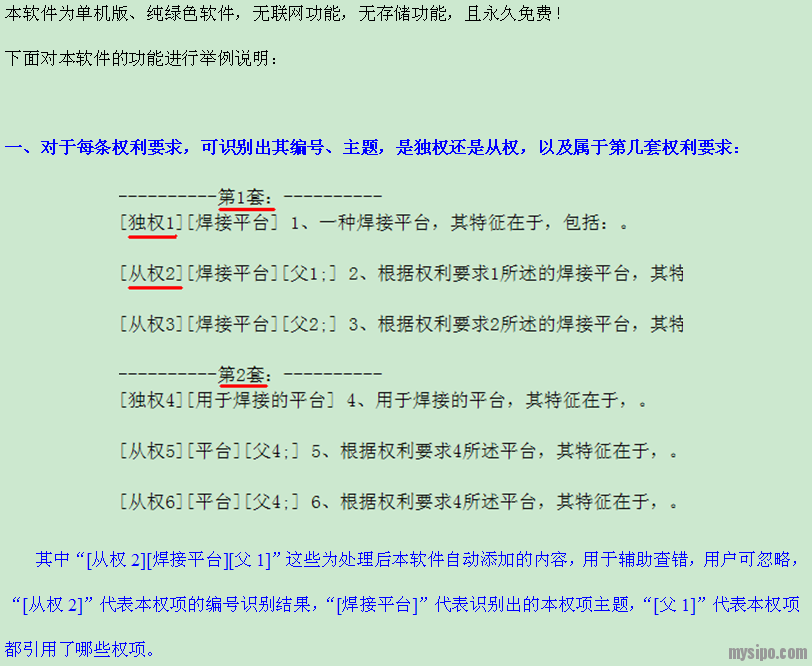 (7)处理后对于每条权项,其开头添加的“[从权17][装置][父1;2;3;]”为辅助查错用,用户可忽略,其中17代表本权项的编号识别结果,[装置]代表识别出的本权项主题,[父1;2;3;]代表本权项直接引用了哪些权项