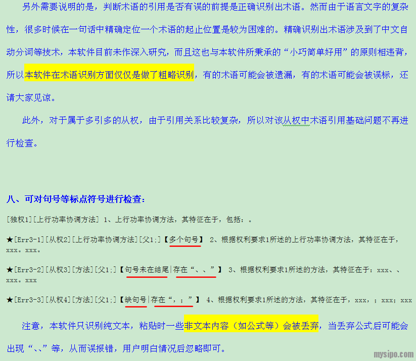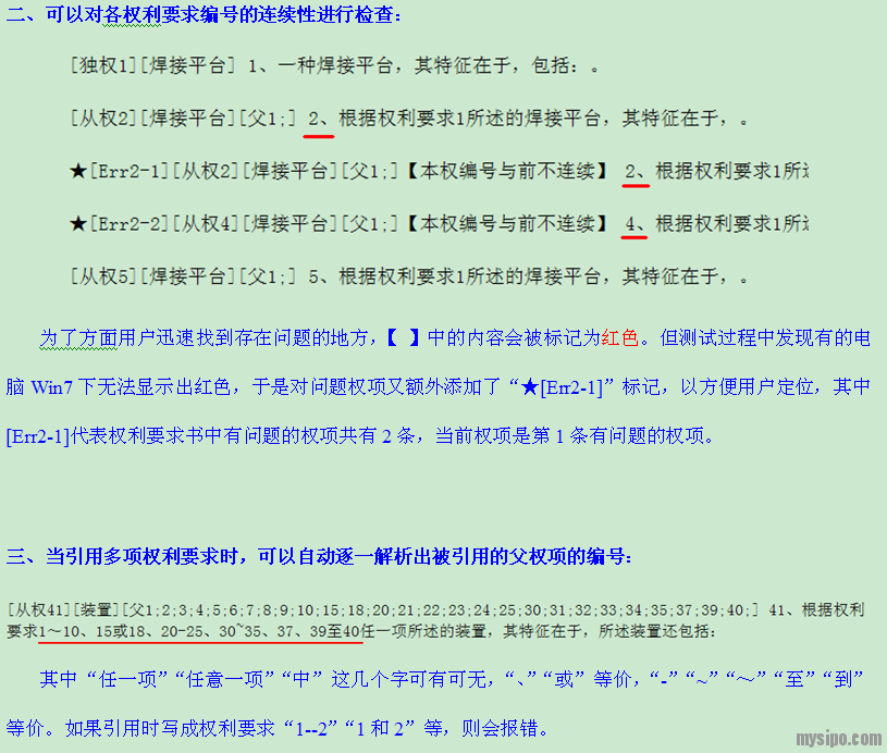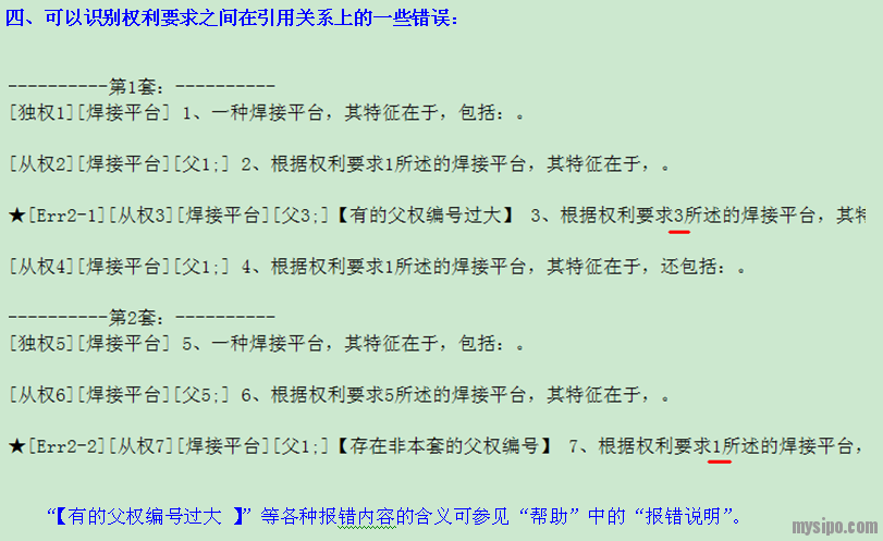 (6)处理后对于存在问题的权项,其开头添加的“【本权编号与前不连续|多引多|缺句号】”等标记代表了该权项都存在哪些问题,其含义见下面的“报错说明”