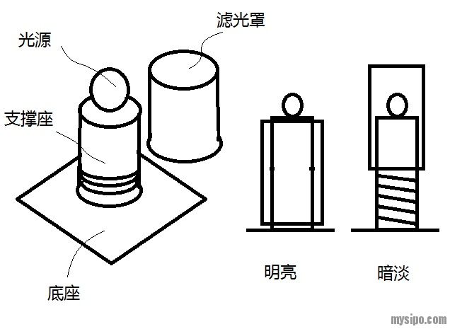 可调光灯,包括灯座,支撑座,支撑座顶部是光源,四方棱柱形滤光罩套设在光源外部,滤光罩分为多个滤光区,可以上下移动,靠销钉定位。