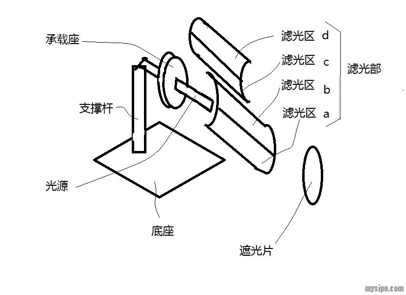 三个滤光区,分界线都设置在以光源为轴心的虚拟圆柱面上,滤光部以该虚拟圆柱面的轴心转动。a区是圆柱面,b区和c区是棱柱设置在虚拟圆柱面上的等边三棱柱形的两个面。
