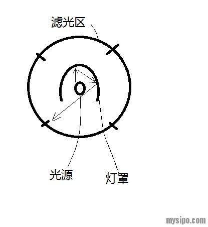 为了抑制小夜灯模式下滤光罩的温升,a区的滤光区距离光源的距离大于其他两个滤光区。