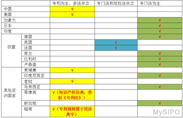 简单做了一个表,希望通过比较形象化的方式来做一个梳理。因为资料有限,只能对主要国家和其他能够获得的国家做了一个对比。对比的角度主要是从发明创造的角度来看各个国家是否通过专利法、专门法与版权法并立以及专门法为主三个方向对外观设计予以保护。