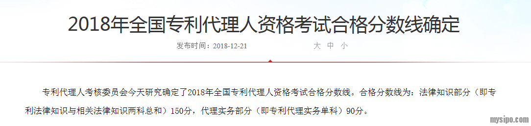 2018年全国专利代理人资格考试合格分数线确定